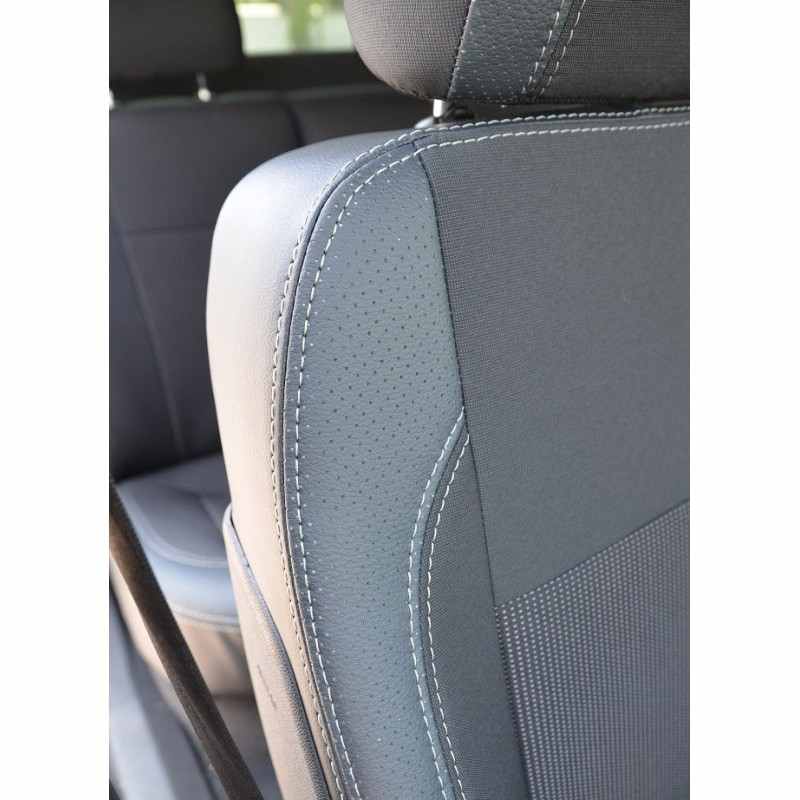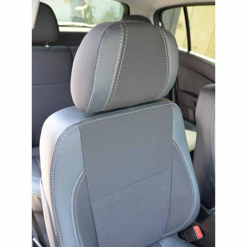 Ткани не имеют неприятного запаха, имеют повышенный срок эксплуатации, гипоалергенны, не растягиваются и долговечнее обычной ткани. Использование комбинации автоткани и экокожи позволяет не заботиться про нагрев сидений летом и чрезмерное охлаждение зимой. Середина чехлов пошита из автоткани, боковые обхваты пошиты из перфорированной экокожи, задняя спинка пошита из гладкой экокожи.